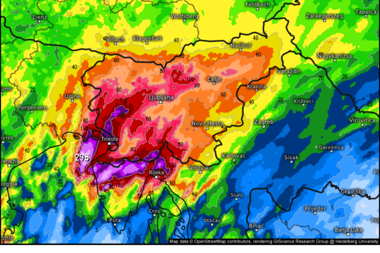 Meteorološki modeli kažejo, da lahko lokalno pade do 300 litrov dežja na kvadratni meter – kar pomeni visoko tveganje za hudourniške poplave, razlivanje rek in zastajanje vode v urbanih območjih.