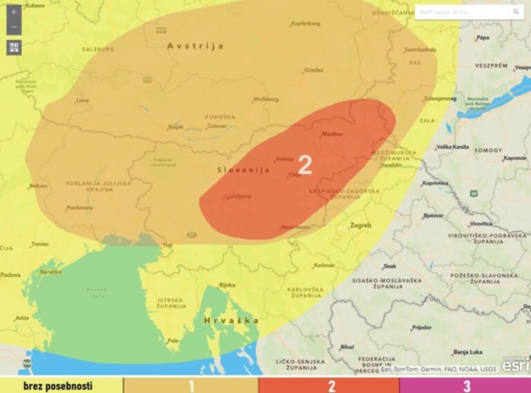 Podrocja z 1. stopnjo nevarnosti zajemajo Notranjsko, Gorisko, Gorenjsko, Primorsko in del avstrijske Koroske. Obmocja z najnizjo nevarnostjo (0 ali 1) – kot so Istra, obala in jug Hrvaske – vecjih tezav danes najverjetneje ne bodo imela.
