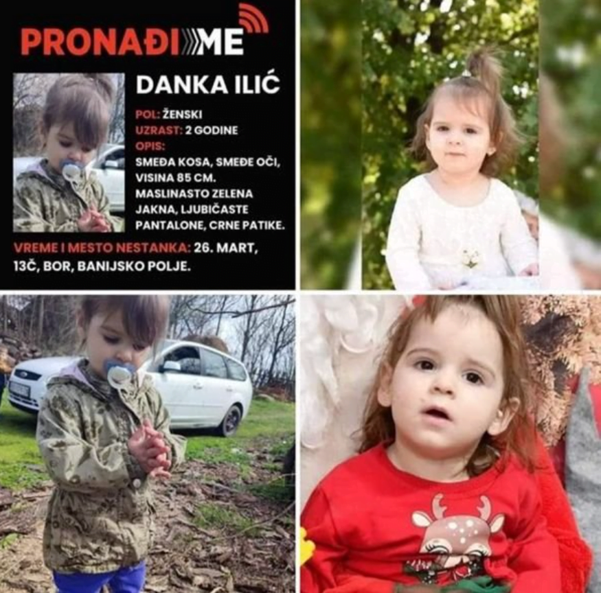 Slovenija – Slovenska in srbska policija sta združili moči v iskanju dveletne Danki Ilić, ki je od torka, 26. marca 2024, pogrešana iz naselja Banjsko Polje v mestu Bor, Srbija. Slovenska policija je danes izdala obvestilo o pogrešani dveletni deklici Danki Ilić in pozvala javnost, naj posreduje morebitne informacije o njej.