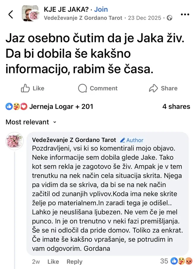 V zadnjih dneh je na Facebooku o primeru spregovorila vedeževalka Gordana. V pogovoru je poudarila, da ne navaja dejstev ali preverljivih informacij, temveč osebne zaznave, ki jih pripisuje jasnočutnosti, jasnoslišnosti in jasnovidnosti. Po njenih besedah ima močan občutek, da je Jaka živ: