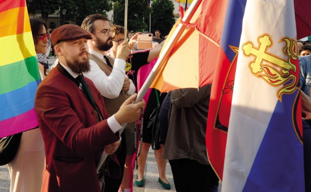 Alen Koman s prijateljem in križem na Paradi ponosa. Svet se vrti, pravi, a križ stoji. © Borut Krajnc