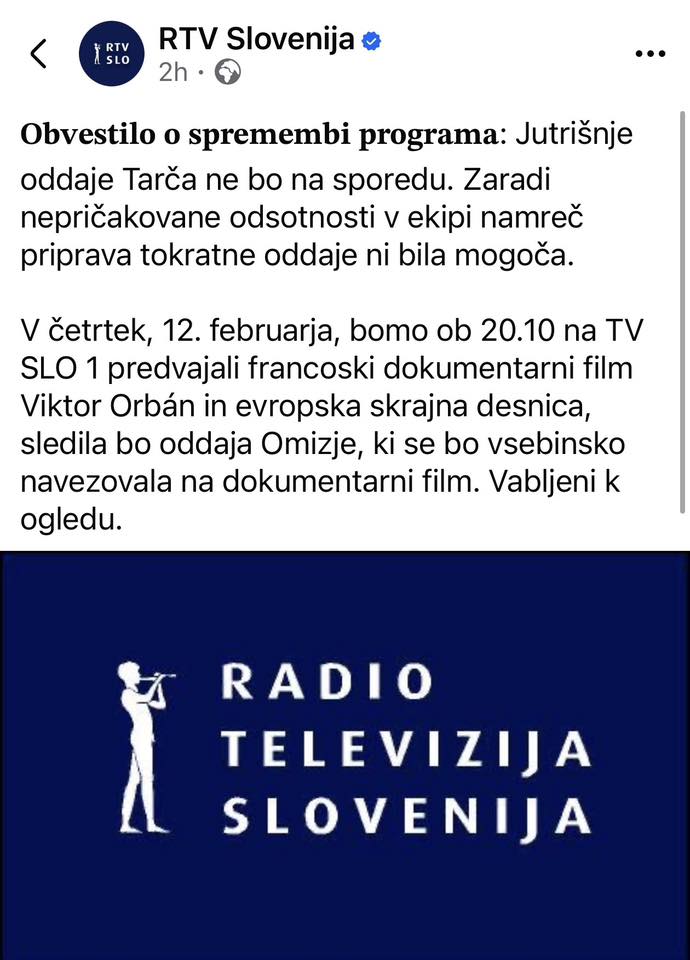 Oddaja Tarča, znana po razkrivanju občutljivih tem, je bila odpovedana tik pred predvajanjem. Uradni razlog, ki ga je sporočilo vodstvo RTV Slovenija, je bil zdravstveni – domnevno je zbolela voditeljica Erika Žnidaršič in del ekipe. Vendar pa so ustvarjalci oddaje na Facebooku objavili zapis, v katerem trdijo, da je odpoved posledica pritiskov vodstva, da spremenijo temo. Načrtovana vsebina naj bi obravnavala zaposlovanje na DARS-u in ministrstvu za kmetijstvo, gozdarstvo in prehrano, kjer naj bi vplivala celo žena predsednika vlade Tina Gaber Golob. “Po naših informacijah je tokratno Tarča ustavila direktorica televizije Ksenija Horvat. Prek odgovorne urednice Polona Fijavž naj bi prišlo do pritiskov na ustvarjalce oddaje, naj zamenjajo temo, vendar so se temu uprli,” piše v objavi na strani SlovenijaInfoPortal.
