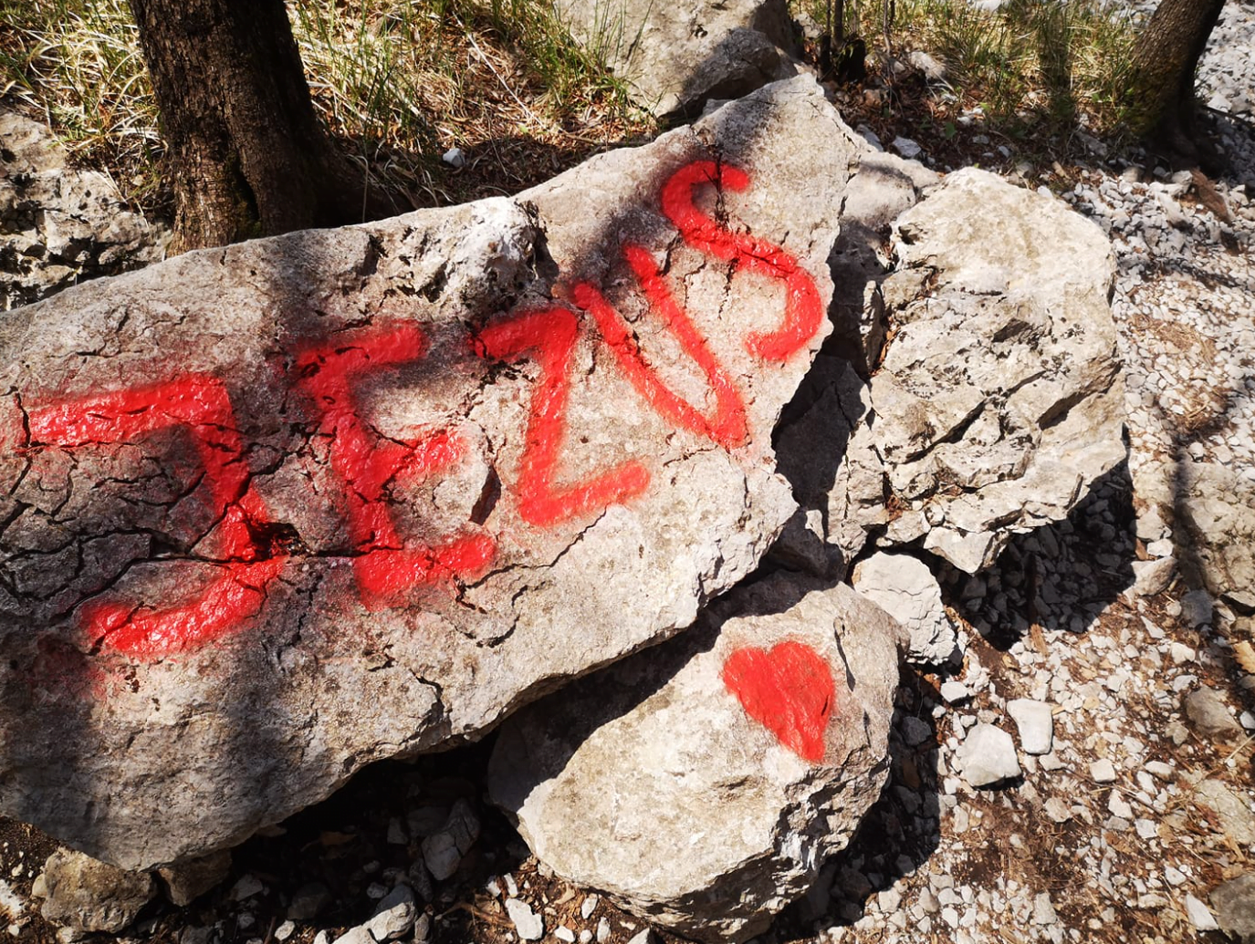 “Iskreno povedano, ne vemo, ali storilca vodi nek višji cilj ali le zlorablja ime Jezusa za grafitiranje. V vsakem primeru povzroča škodo, zavaja planince in kazi naravo,” nam je o grafitih, ki so se v četrtek pojavili ob poti na Nanos, povedal markacist postojnskega planinskega društva Matevž Kovačič….