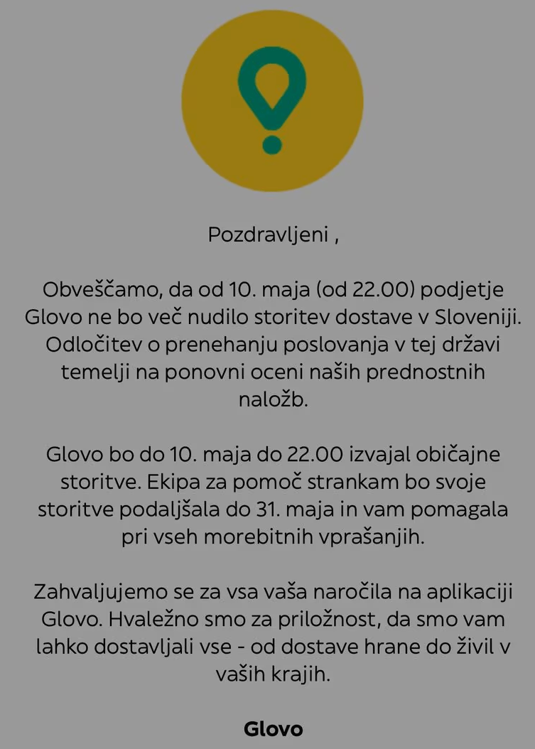 Priljubljena platforma za dostavo hrane Glovo bo z 10. majem prenehala s svojim poslovanjem v Sloveniji. Odločitev za zaprtje operacij v državi izhaja iz “ponovne ocene prednostnih naložb,” je navedeno v obvestilu, ki so ga prejeli uporabniki storitve.