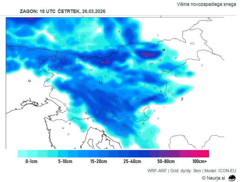 Ob dotoku hladnejšega zraka se bo meja sneženja občasno spustila zelo nizko. Največja verjetnost za sneg ostaja v višjih legah, vendar lahko ob intenzivnih padavinah in dovolj nizkih temperaturah sneg prehodno doseže tudi nižine – zlasti na zahodu in v osrednji Sloveniji. Natančna višina snežne meje bo odvisna od temperature v spodnjih plasteh ozračja in jakosti padavin. Gre za tipičen pomladni scenarij, ki lahko preseneti, a ni povsem redek.