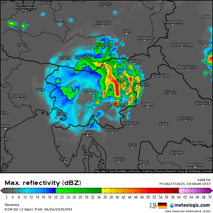 🕛 Časovni okvir: Nevihtni pas naj bi nastal nad Furlanijo okrog polnoči, nato pa hitro prešel mejo in zajel Goriško, Notranjsko, del osrednje Slovenije ter Štajersko. Najintenzivnejše dogajanje je pričakovano med 00:00 in 03:00 zjutraj.
