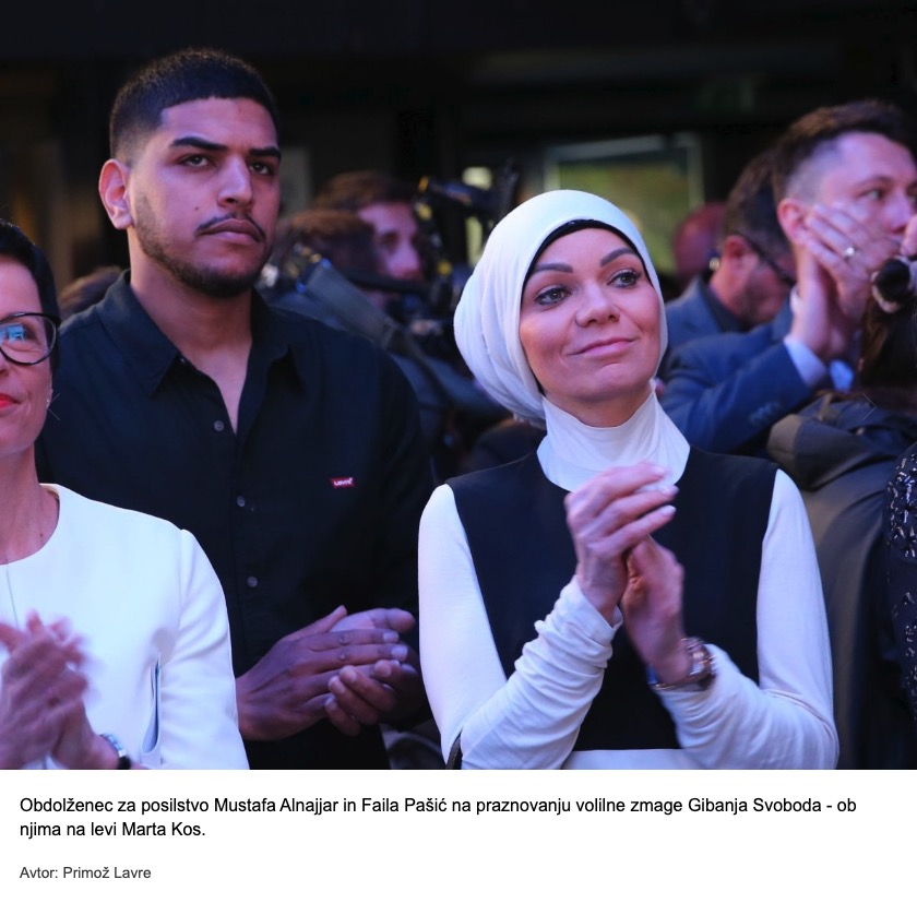 V javnosti krožijo njegove fotografije z volilnega večera leta 2022, ko je skupaj s svojo nekdanjo partnerko, aktivistko Failo Pašić, prišel v volilni štab Gibanja Svoboda na proslavljanje zmage. Na sliki stoji Mustafa Alnajjar tik ob Urški Klakočar Zupančič in Marti Kos – sedem mesecev po prijavi za posilstvo mladoletnice.
