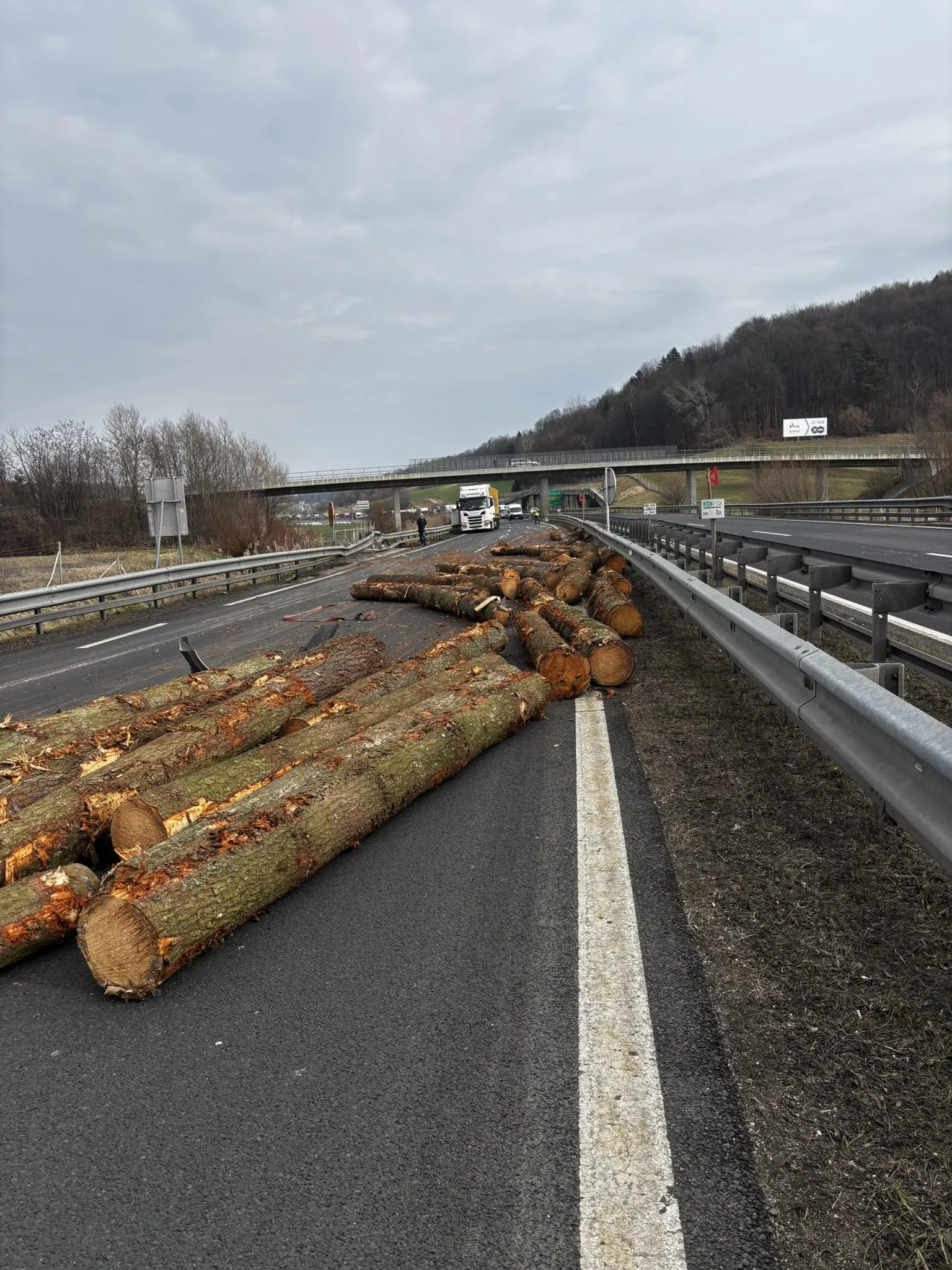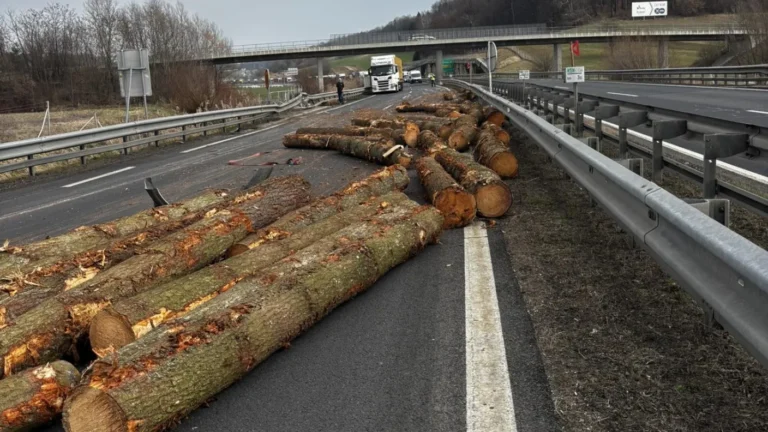 Vozniki so priča prizoru, ki spominja na filme – hlodi so se raztresli po cesti, kar je povzročilo popolno zaporo avtoceste do nadaljnjega.