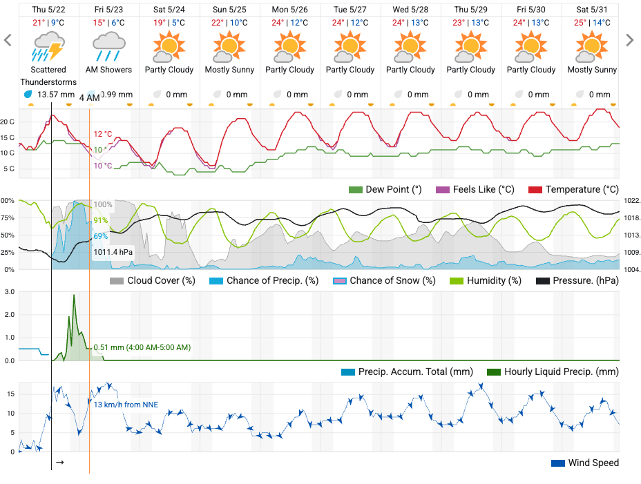 Fronta bo Slovenijo dosegla v noči na petek (23. 5.), že v četrtek popoldne pa se bodo začele pojavljati nevihte z nalivi in lokalno tudi sodra. Ob prehodu bo zapihal okrepljen severni veter, meja sneženja pa se bo spustila do okoli 1500 metrov nadmorske višine.