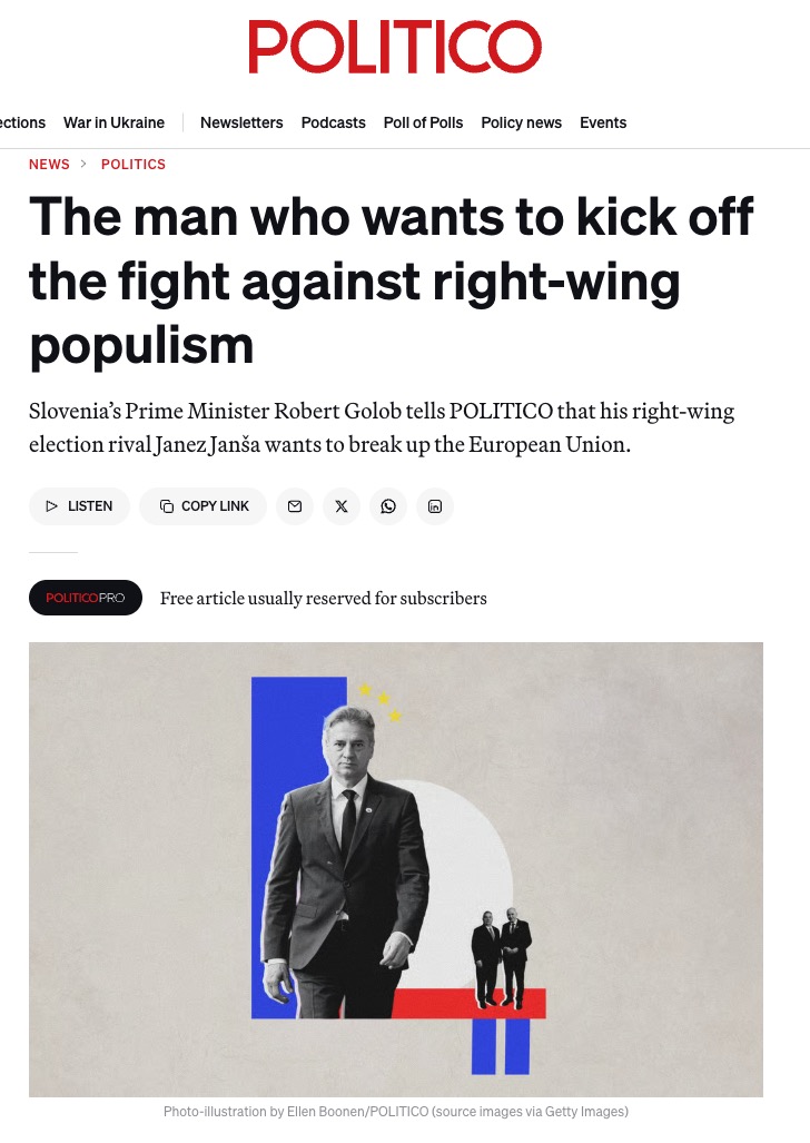 V tem primeru je še posebej pomenljivo, da je bil intervju objavljen prav v času, ko se politični boj v Sloveniji zaostruje. POLITICO je Goloba predstavil kot človeka, ki želi sprožiti nov boj proti desnemu populizmu, slovensko politično tekmo pa umestil v širši evropski ideološki spopad. Že sam okvir članka je tak, da Goloba postavlja na stran “proevropskih sil”, Janšo pa na stran nevarnega populizma.