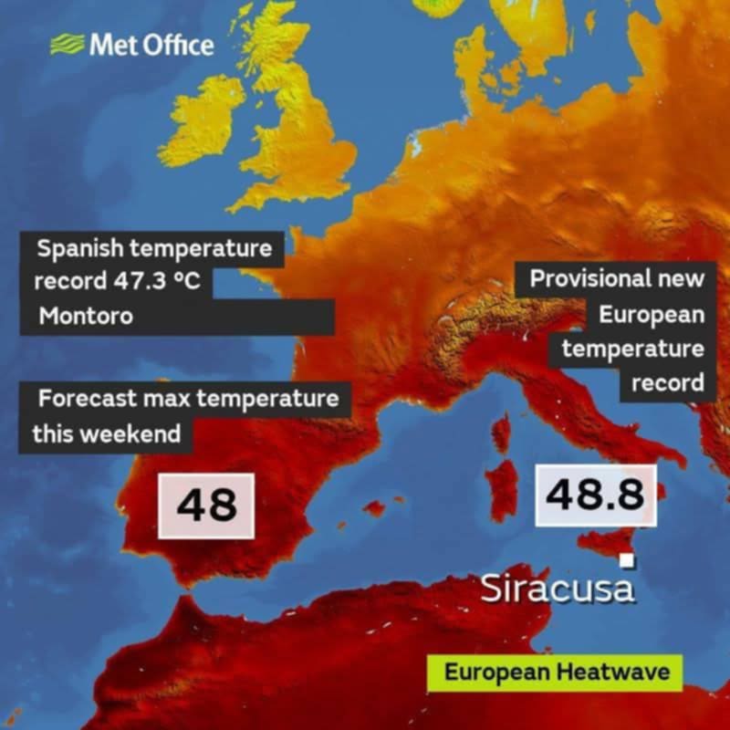 Vročina, ki dosega skoraj 50 °C v Španiji in Italiji, ne ostane lokalna. Takšne zračne mase se običajno pomikajo proti severu – tudi proti Sloveniji, Hrvaški in Madžarski. Vročinski jezik bo po vsej verjetnosti do sredine tedna dosegel tudi nas. -